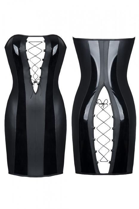 Ένα αισθησιακό φόρεμα σχεδιασμένο για πικάντικα παιχνίδια. Συνδυασμός οικολογικού δέρματος με λακαρισμένο, γυαλιστερό υλικό. Μακριά κάθετα κοψίματα με κορδόνια στο μπροστινό μέρος της λαιμόκοψης και στο πίσω μέρος των γλουτών, ενθαρρύνουν να προκαλούν και να ανεβάζουν τη θερμοκρασία των παιχνιδιών. Τα μακριά κάθετα στοιχεία από λακαρισμένο υλικό στο μπροστινό και πίσω μέρος του φορέματος φαίνονται όμορφα και ενδιαφέροντα. Τα ευέλικτα χαρακτηριστικά του υλικού το κάνουν να ταιριάζει απόλυτα στο σώμα, τονίζοντας το σχήμα του.